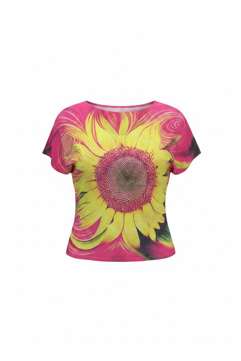 Make a statement with this vibrant floral print T-shirt, designed to bring color and energy to your everyday style. Featuring a striking oversized sunflower motif in vivid yellow tones set against a rich pink background, this piece captures a bold and artistic spirit.