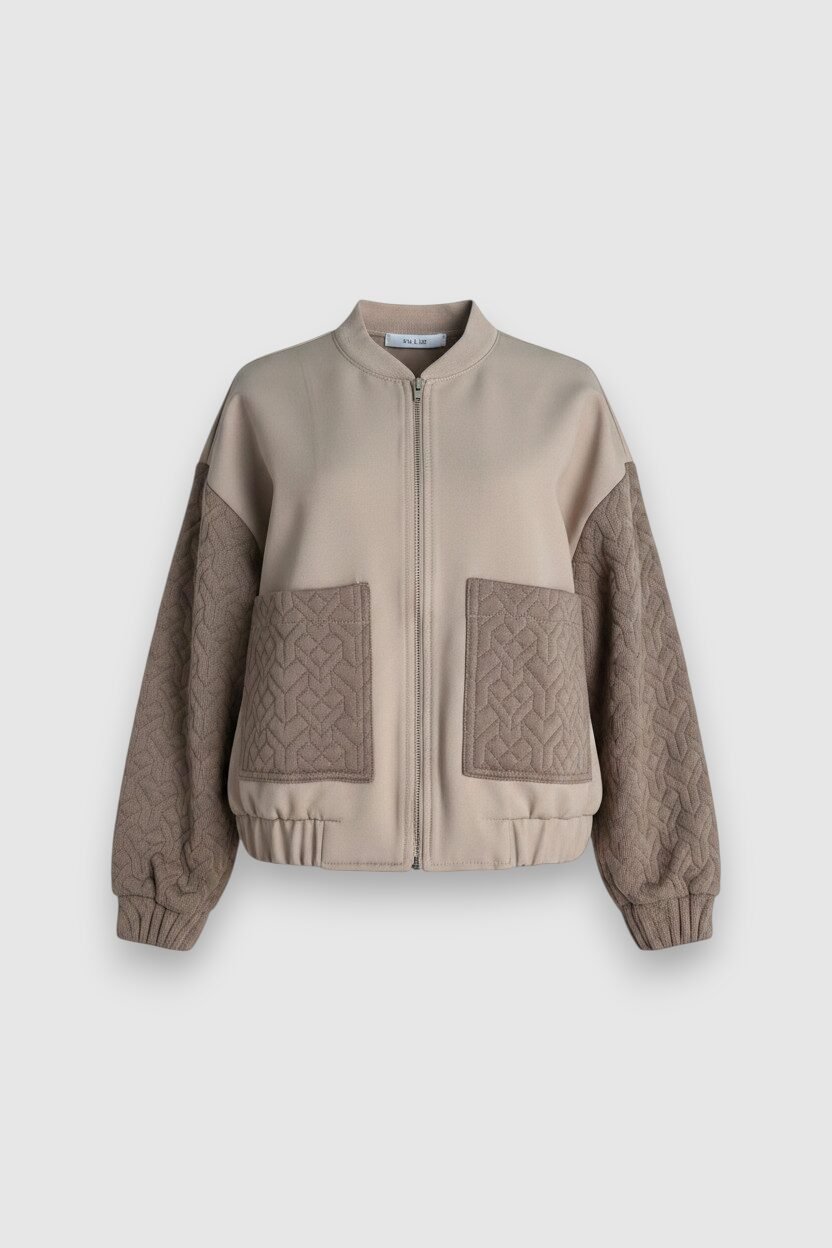 The contrast between the smooth body and the textured knit sleeves and patch pockets adds depth and visual interest, while maintaining a refined, minimalist aesthetic. The elasticated hem enhances the fit, creating a balanced and modern silhouette.
